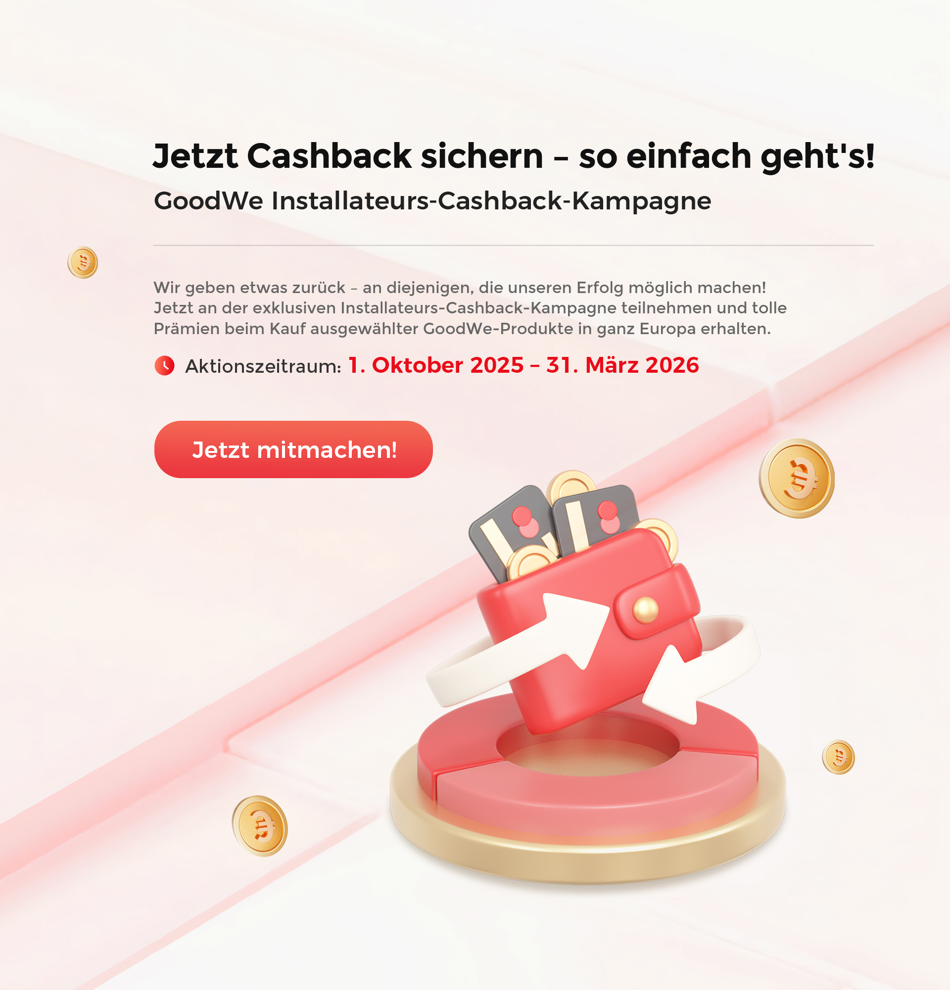 GoodWe 15 Jahre – Cashback-Kampagne für Installateure Teilnahmebedingungen & Infos Bitte wenden Sie sich direkt an den GoodWe After-Sales-Service in Ihrem Land.